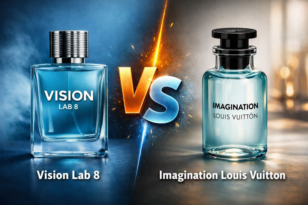 Comparando o Vision Lab 8 com o perfume Louis Vuitton Imagination, encontramos algumas similaridades, mas também diferenças marcantes. Ambos possuem uma proposta olfativa que busca transmitir frescor e sofisticação, embora o Vision se destaque pela sua acessibilidade. Enquanto o Imagination foi projetado para uma clientela mais elitista, focando em notas que vão do cítrico ao amadeirado, o Vision consegue oferecer uma interpretação mais prática e versátil dessa proposta.